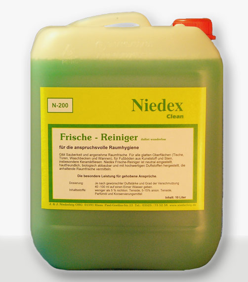 Frischereiniger für die anspruchsvolle Raumhygiene, grün, neutraler, hautfreundlicher Reiniger für alle glatten Oberflächen, Kunststoff- und Steinfußböden. Hinterläßt eine hervorragende, anhaltende Duftfrische. Die Sonderleistung für gesteigerte Ansprüche.
