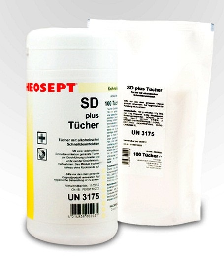 Feuchte Desinfektionstücher im Format 130x200 mm, getränkt mit RHEOSEPT-SD plus. RHEOSEPT-SD plus ist eine aldehydfreie Wischdesinfektion mit angenehmen Geruchseigenschaften zur Durchführung schneller und