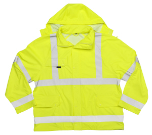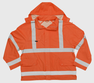 Wind- und wasserdicht. Fluoreszierend, mit Reflexschulterstreifen und waagerechten Reflexen. Nähte sind verschweißt. Kapuze mit im Kragen verdeckten Schnüren. Verschluss mit Reißverschluss und Wetterschutzleiste mit Druckknöpfen. Brusttasche mit Patte und Druckknopf. Vordertaschen mit Patte und Druckknopfverschluss. Ventilation im Rücken. Gummizug in der Unterkante, regulierbar. Druckknopfregulierung an den Handgelenken. Zertifiziert nach EN 471 - Kl. 3/2. Material: 70% Polyester 30% Polyurethan