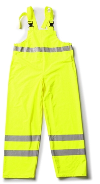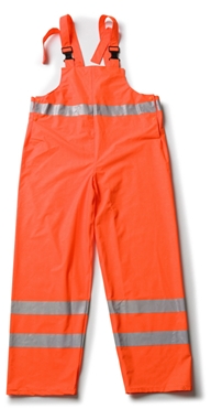Wind- und wasserdicht. Fluoreszierend mit Reflexen. Nähte sind verschweißt. Schulterträger aus Stoff, verstellbar und mit kurzem, kräftigem Gummizug sowie Kunststoffschnallen versehen. Druckknöpfe an den Seiten. Druckknopfregulierung an den Fußgelenken. Zertifiziert nach EN 471 - Kl. 2/2. Material: 70% Polyester 30% Polyurethan