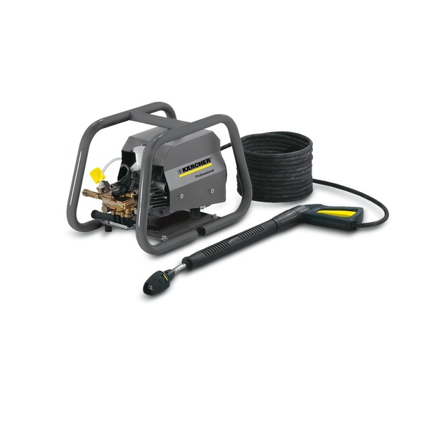 Ein tragbarer Kaltwasser-Hochdruckreiniger, der auf die speziellen Bedürfnisse des Malers und Fassadenreinigers hin entwickelt wurde. Das handliche, in einem Rohrrahmen untergebrachte Wechselstromgerät eignet sich besonders für den Einsatz auf dem Gerüst. Sein Strahlrohr ist kurz (540 mm), so kann auch auf dem Gerüst ein genügend großer Spritzabstand eingehalten werden. Es ist außerdem drehbar in der Spritzpistole gelagert, so dass alle Stellen ohne akrobatische Verrenkungen erreicht werden können. Die neue Dreifachdüse, die zur Grundausstattung gehört, erlaubt ein schnelles wechseln der Strahlart. Je nach Reinigungsaufgabe kann auf Hochdruck-Punktstrahl, Hochdruck-Flachstrahl 25° oder Niederdruck-Flachstrahl 40° umgeschaltet werden. Bei hartnäckigen Reinigungsproblemen wie Kalkausblühungen kann man auch die bekannte Dreckfräserdüse (Rotordüse) verwenden, die zu jedem Kärcher-Hochdruckreiniger passend erhältlich ist. Für den Hochdruckschlauch hat man sich für eine besonders gute Qualität entschieden: er ist ausgesprochen robust. Das Hochdruckaggregat ist in einem stabilen Rohrrahmen untergebracht, wo es vor mechanischen Einwirkungen rundum geschützt ist. Es ist auf Gummifüßen gelagert, um ein Übertragen von Schwingungen auf das Baugerüst zu verhindern, das Gerät kann also nicht"wandern". Motor und Elektrik sind spritzwassergeschützt in einem Gehäuse untergebracht. Die Drei-Kolben-Axialpumpe mit Edelstahlkolben und Messingzylinderkopf garantieren hohe Standzeiten und eine geringe Störanfälligkeit. Die Druckschaltersteuerung schaltet den Motor selbständig ab, sobald die Wasserzufuhr an der Handspritzpistole unterbrochen wird. Dadurch wird ein energiesparendes Arbeiten ermöglicht.