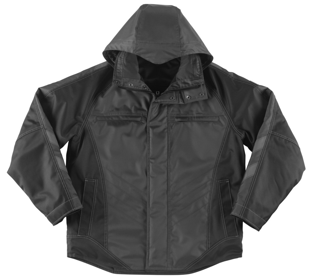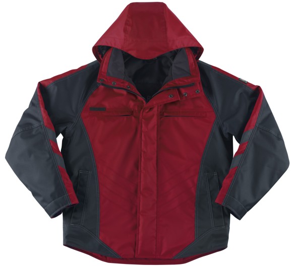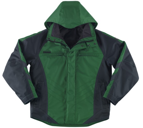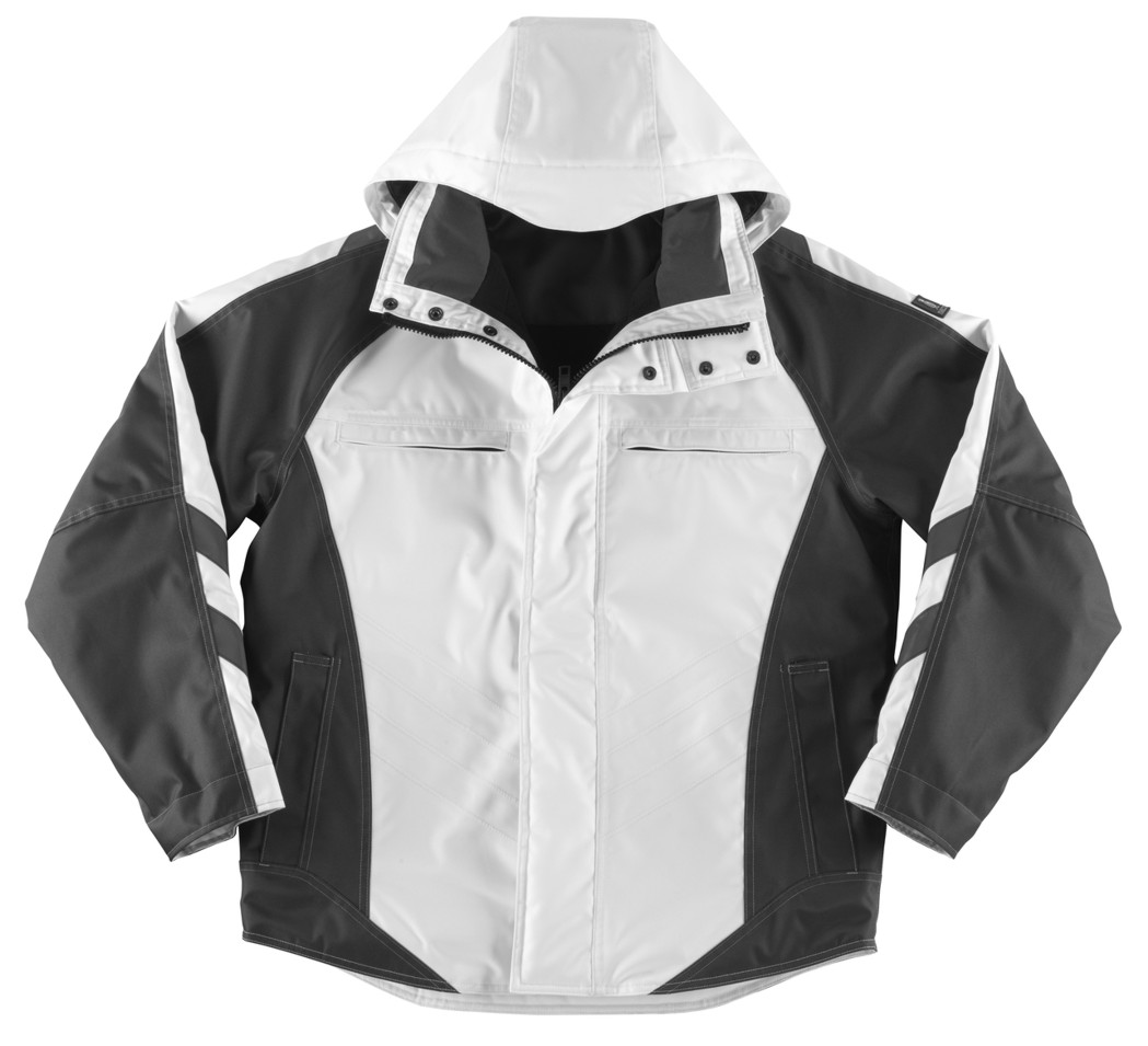 Zweifarbig. Atmungsaktiv, wind- und wasserdicht. Nähte sind verklebt. Kapuze ist abnehmbar, gefüttert und mit verstellbaren Elastikschnüren versehen. Futter aus gestepptem Fleece. Verschluss mit Reißverschluss und Wetterschutzleiste mit Druckknöpfen. Reißverschlusstasche unter der Wetterschutzleiste. Brusttaschen mit Reißverschluss. Leichter Eingriff zur integrierten Handytasche in der Brusttasche. D-Ring. Vordertaschen. Innentasche mit Reißverschluss. Rippenbündchen (verdeckt unter der Wetterschutzleiste) an den Handgelenken. Innen verstellbares Zugband in Hüfthöhe. Reißverschluss im Futter am Rücken zwecks Anbringen eines Logos/einer Stickerei. Reflexeffekte. Zertifiziert nach EN 343 - Kl. 3/1 und EN 342 - Kl. 3/2 (2,0 clo). Material: 100% polyester