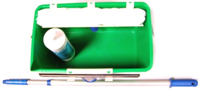 1 kleiner Fenstereimer mit Sieb + Bügel 37cm, Strip Pac 35cm, S-Wischer 35cm, 1 Teleskopstange 2 x 1,25m, 1 Liter PUDOL Glasrein Konzentrat